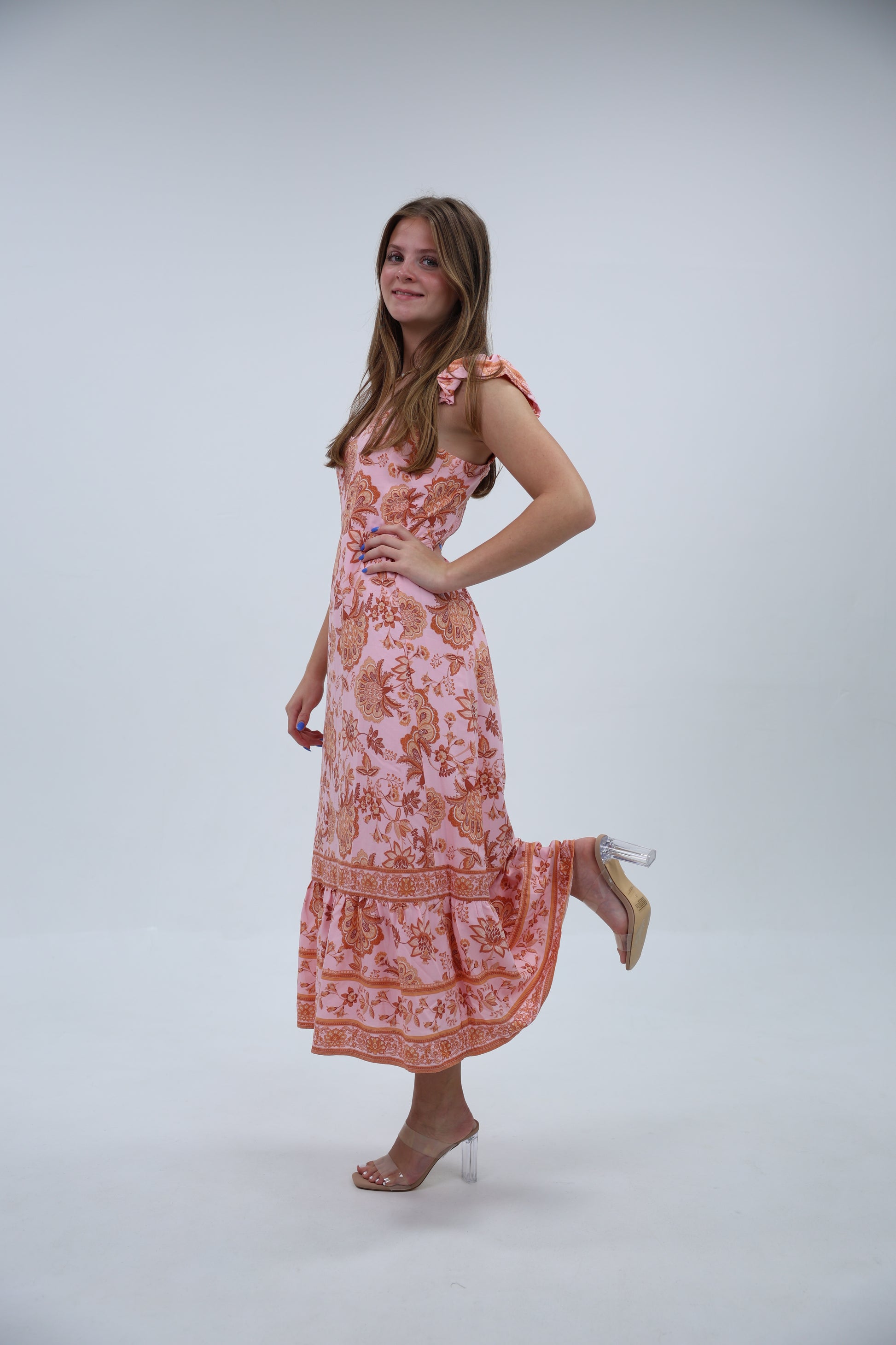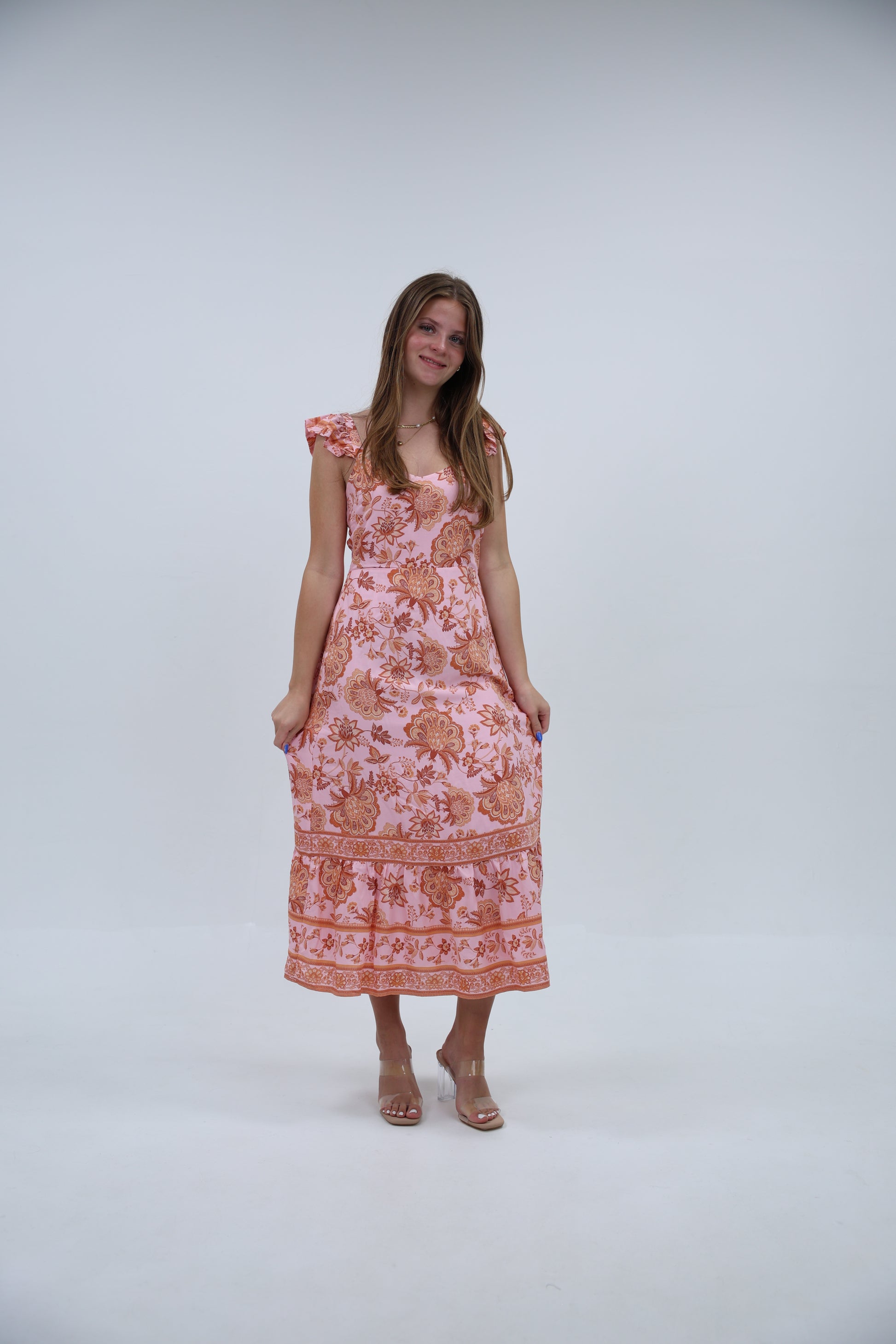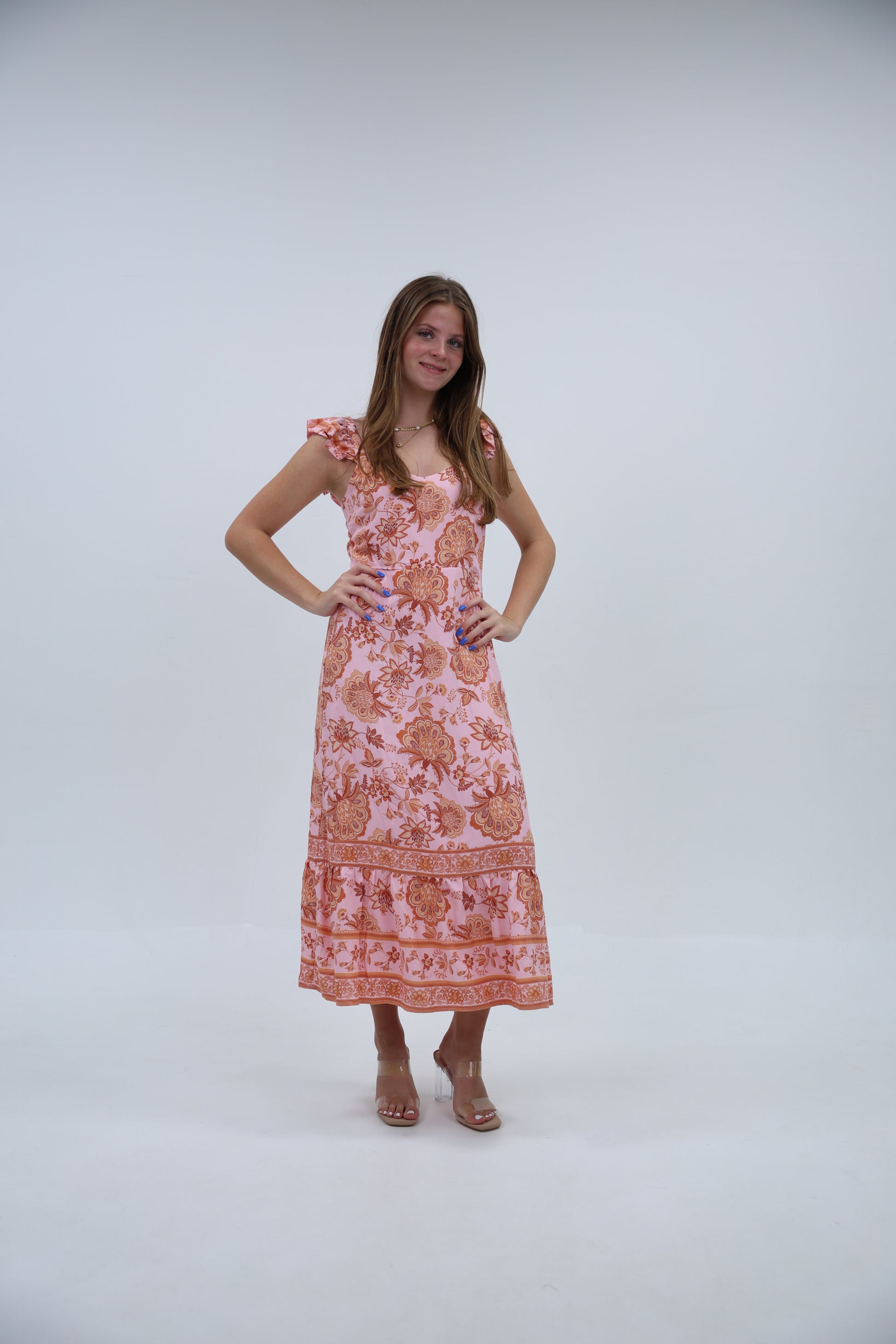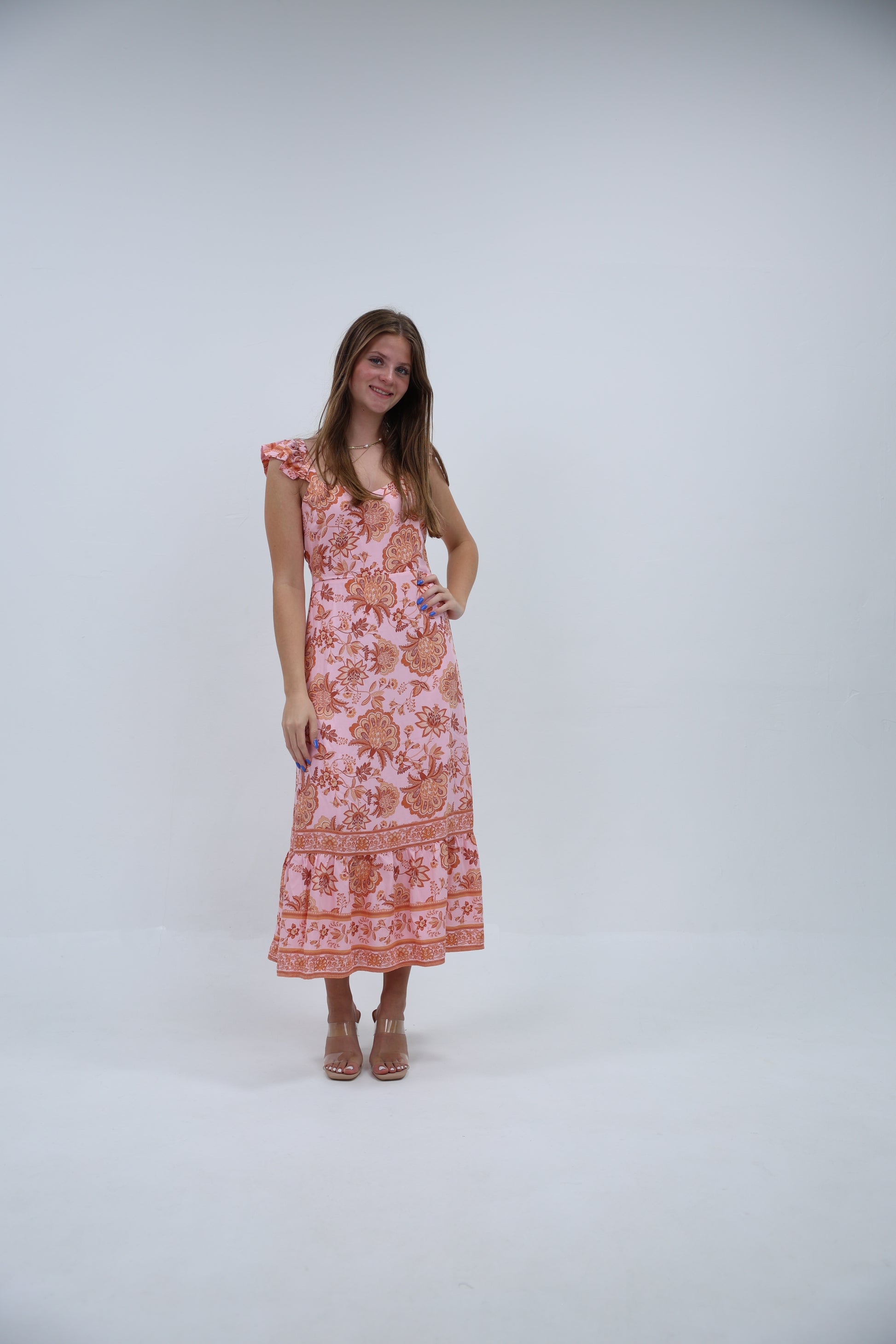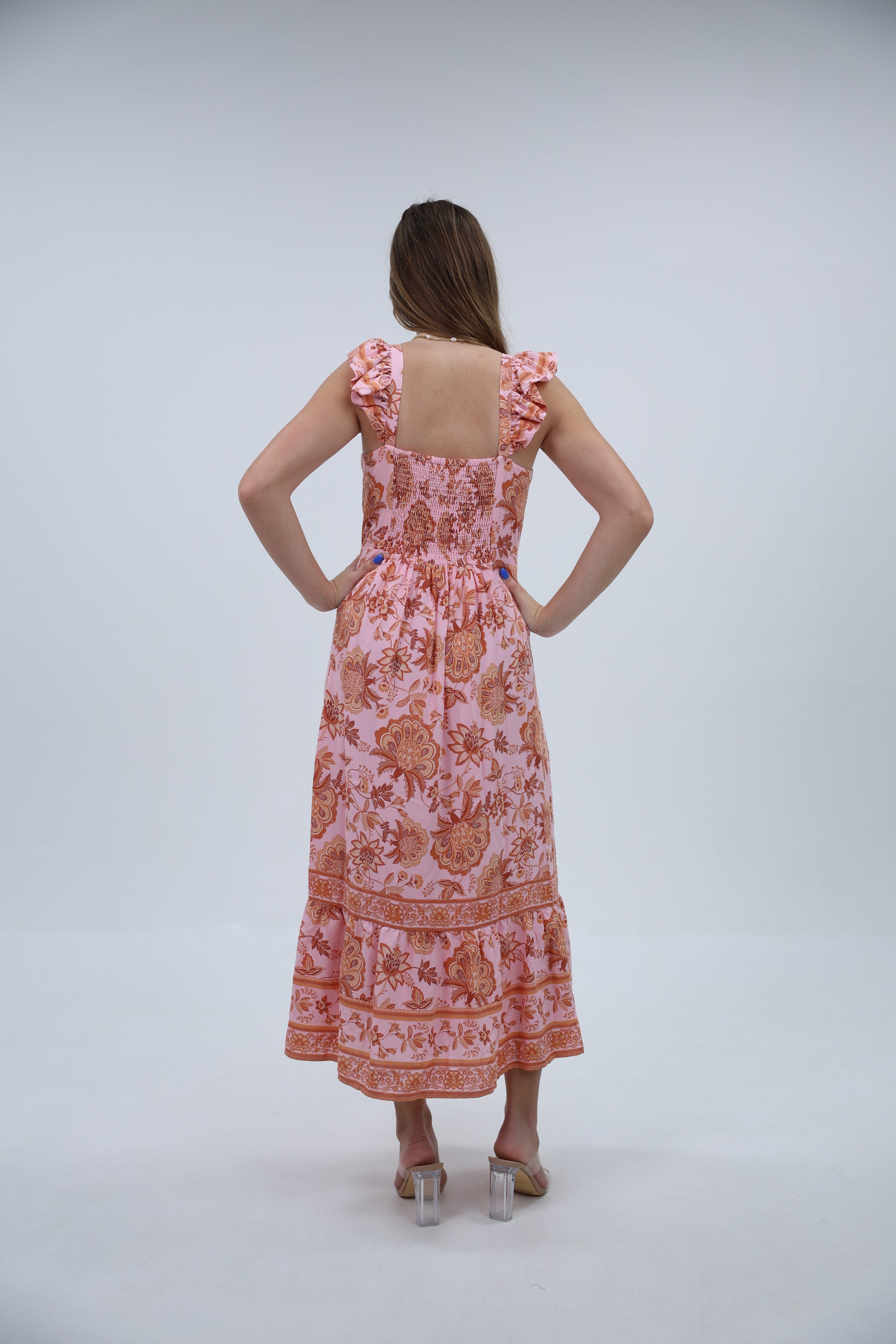 A boho-inspired full-length dress in warm pink and orange tones, featuring flowing fabric and relaxed elegance for a free-spirited, effortlessly stylish look.