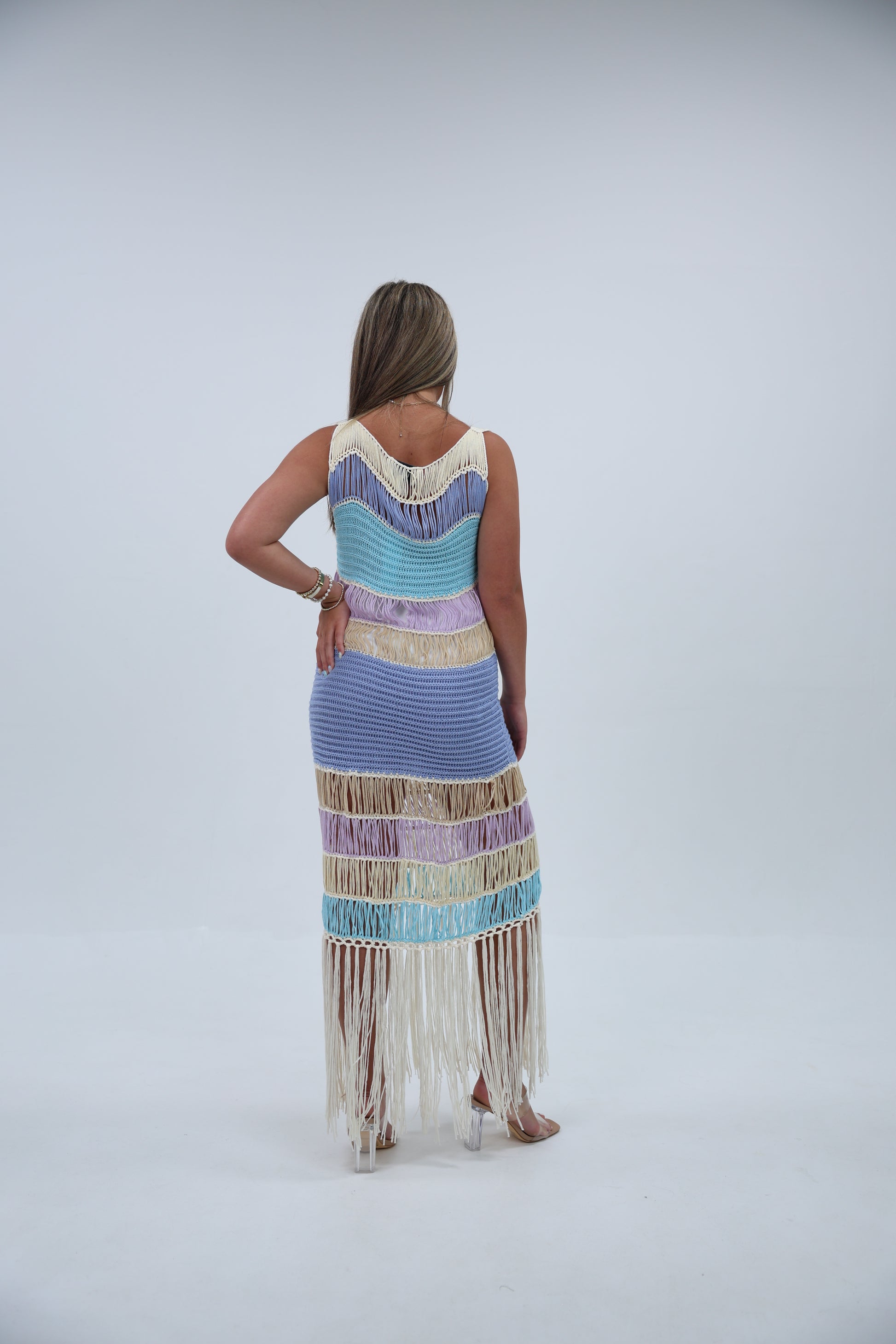 A stunning crochet long dress showcasing vibrant multi-color block stripes, blending bohemian charm with bold, eye-catching style for a unique and timeless look.