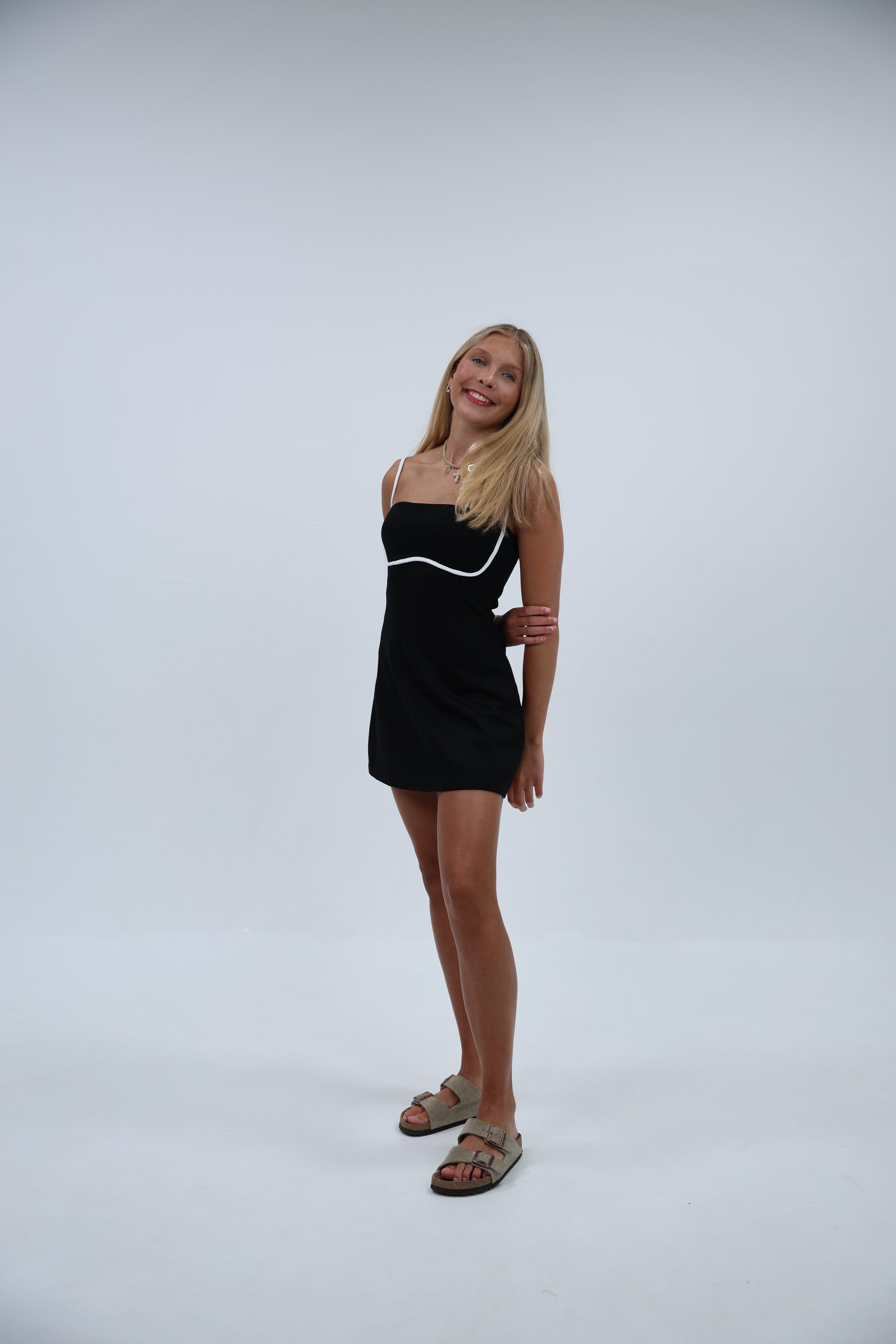 Sleek and playful, this black mini dress is a wardrobe must-have. Designed with a flattering silhouette and a chic white contrast trim along the neckline, it strikes the perfect balance between casual and elevated. Ideal for everything from day trips to dinner dates, just swap your sandals for heels and you’re good to go!