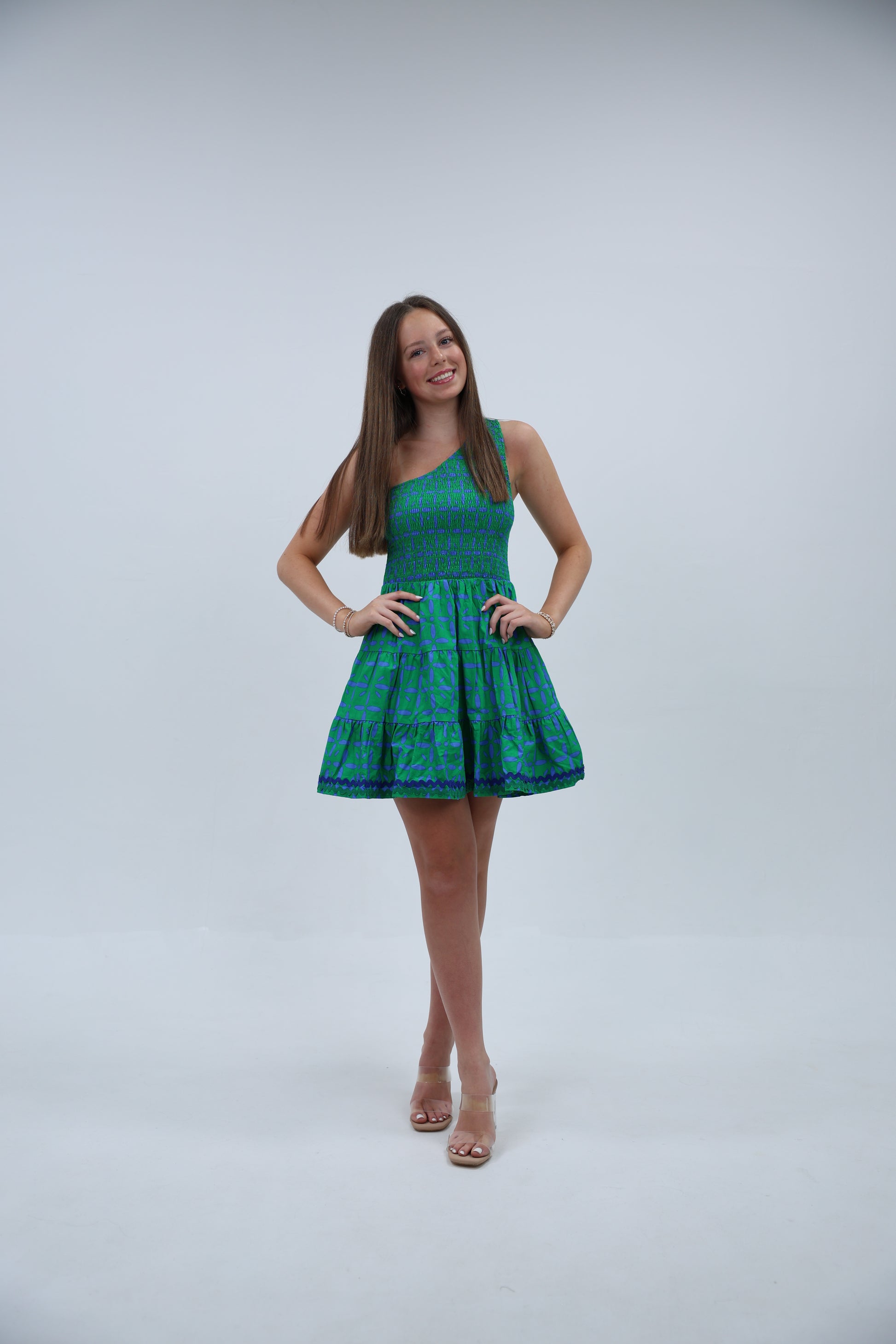 A chic one-shoulder green dress with a flattering neckline and a playful frilly skirt that adds movement and flair. Perfect for standing out with effortless style and feminine elegance.